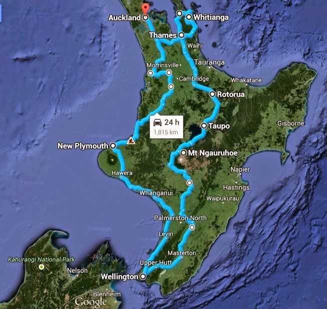 Approximate map of North Island Tour route. Started in Auckland and ended in Auckland. I know the little tag says 1815 kilometers, but in reality we clocked about 2000 kilometers. |